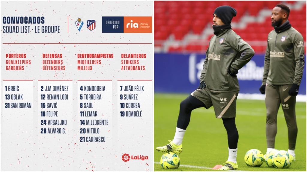 Convocatoria: Oblak, Grbic, San Román; Giménez, Lodi, Savic, Felipe, Vrsaljko, Álvaro; Kondogbia, Torreira, Saúl, Lemar, Llorente, Vitolo, Carrasco; Correa, Joao Félix, Luis Suárez y Dembélé.