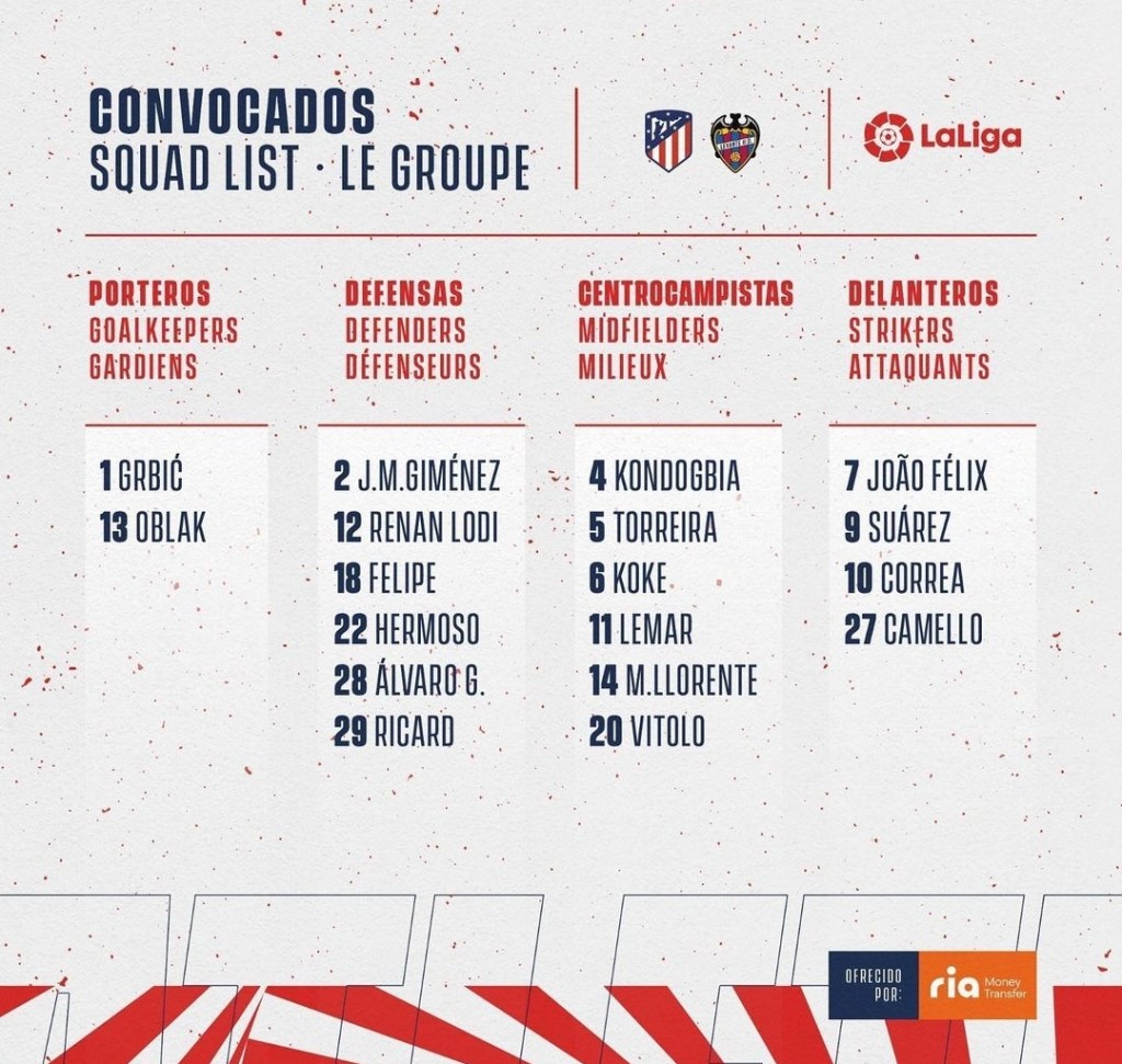 Simeone sólo ha podido comvocar a 15 jugadores del primer equipo, completando la lista los defensas Álvaro y Ricard y el delantero Camello, todos ellos del filial rojiblanco.