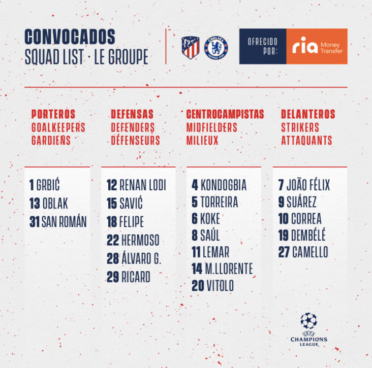 En esta no ha entrado Trippier (sancionado), Herrera, aún convaleciente de coronavirus, así como Carrasco, Giménez y Vrsaljko, los tres recientemente lesionados. No obstante completan la expedición colchonera los jugadores del filial, San Román, Ricard, Álvaro y Camello