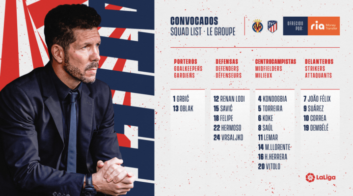 Simeone tendrá las bajas de los lesionados Carrasco y Giménez y del sancionado Trippier. Por su parte, en el Villarreal no pueden contar con Iborra, Coquelin, Gaspar y Alberto Moreno.