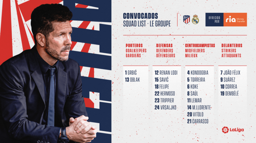 Simeone tendrá la única baja de Giménez. Mientras que Zinedine Zidane no podrá contar con Carvajal, Sergio Ramos, Hazard y Mariano.