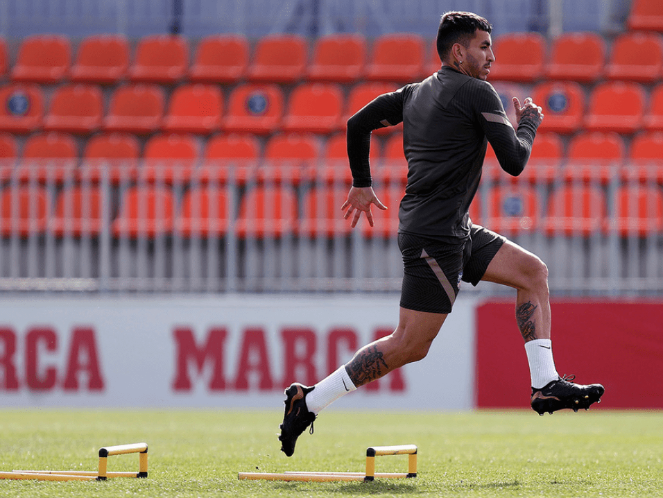 Buenas noticias en el entrenamiento matutino del Atletico de Madrid. Mientras los integrantes de la plantilla no convocados por sus respectivas selecciones se entrenaban en el Cerro del Espino, Dembélé saltaba al césped para hacerlo en solitario junto al preparador físico, Óscar Pitillas.