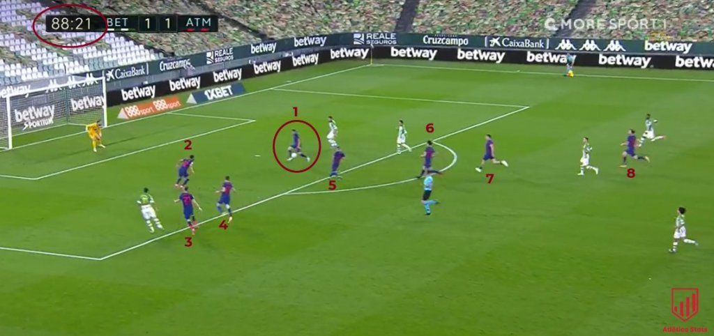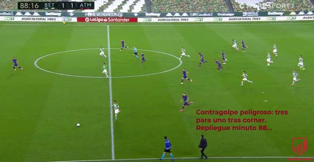 Carrasco sacó un córner para los colchoneros, que trágicamente acabó en un contragolpe vertiginoso del Betis. Tres jugadores verdiblancos se abalanzaban sobre la meta de Oblak, que estaba protegida tan solo por Lodi, que cerraba… Pero ahí apareció el compromiso y la solidaridad de la que hace gala siempre Simeone.