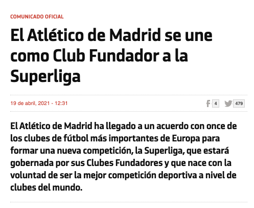 «El Atlético de Madrid ha llegado a acuerdo con once de los clubes de fútbol más importantes de Europa para formar una nueva competición, la Superliga, que estará gobernada por sus Clubes Fundadores y que nace con la voluntad de ser la mejor competición de clubes del mundo«, así comienza el comunicado oficial que la entidad de la osa y el madroño ha publicado para afirmar que es uno de los 12 equipos fundadores y que el torneo cuento con su total apoyo.