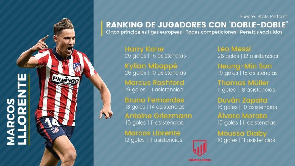 Un doble-doble al más puro estilo NBA y que no se veía en el Atlético desde hace dos temporadas (2018-19), cuando en actual jugador del FC Barcelona, Antoine Griezmann, cosechó 21 dianas y diez asistencias.