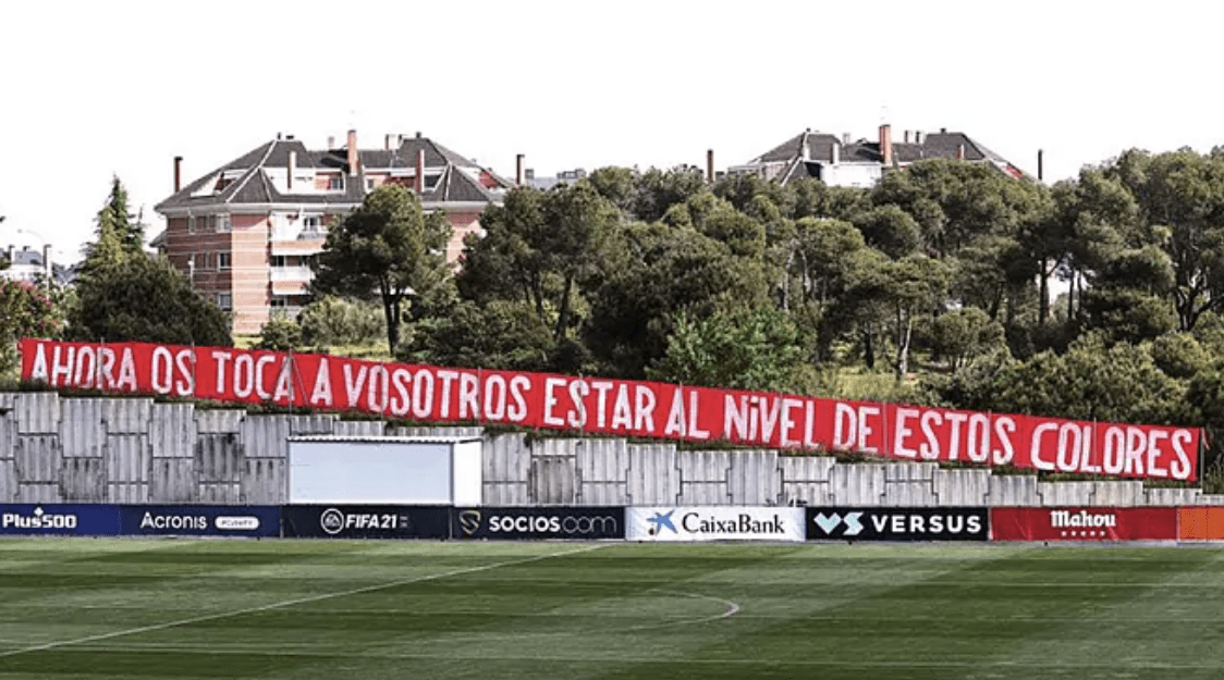 Como de costumbre, la hinchada rojiblanca ha vuelto a mostrar su máximo apoyo a sus hombres desplegando una nueva pancarta. La del día de hoy rezaba: «Ahora os toca a vosotros estar al nivel de estos colores».