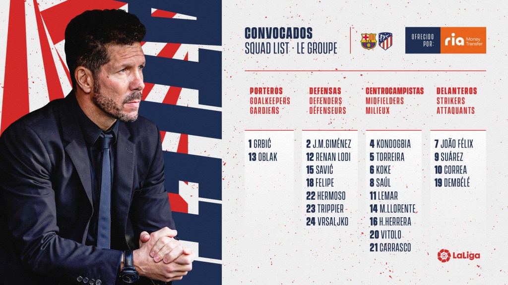 Simeone, por primera vez en lo que va de 2021, no cuenta con ninguna baja. Mientras que Koeman (sancionado) no podrá contar ni con Coutinho ni con Ansu Fati.
