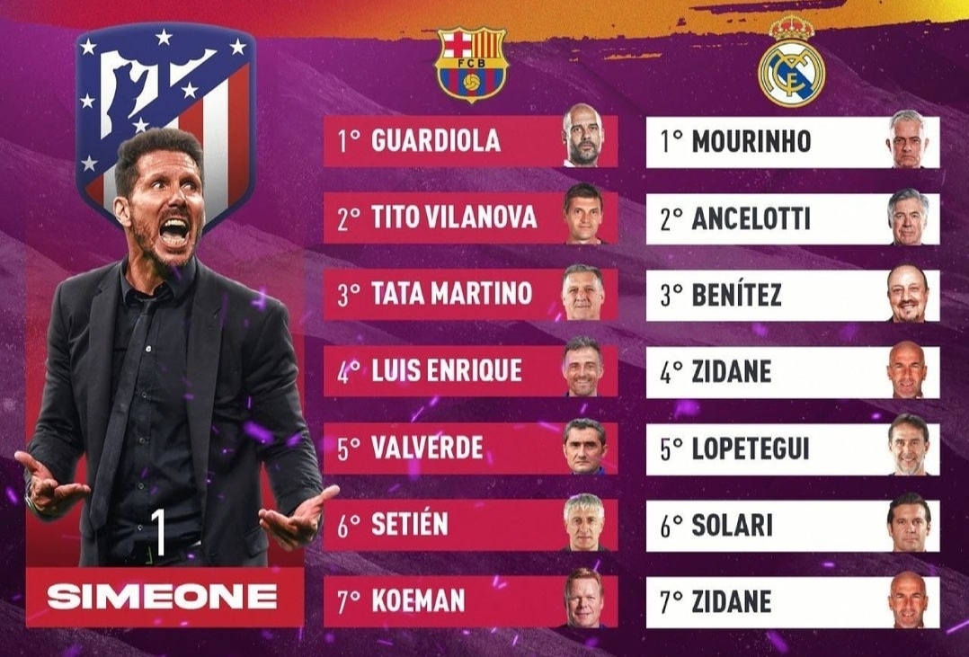 Unas listas de entrenadores que, sin duda, dejan en gran lugar el papel que Diego Pablo Simeone lleva realizando casi diez años en el Atlético.