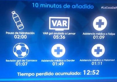 Según las cuentas del medio, 2′ fueron de pausa de hidratación, 5’36» tardó el colegiado en anular gol de Lemar, 1’09» duró la asistencia médica a Felipe, 1’07» duró la revisión del gol de Carrasco, mientras que las asistencias médicas de Darder y Melamed fueron de 1’49» y 1’11’ respectivamente.