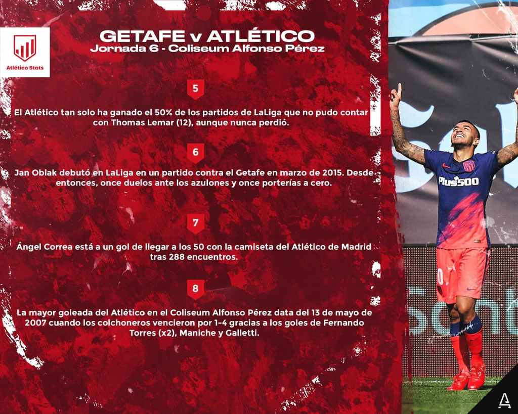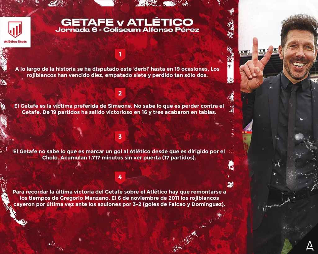 Así mismo, el Atlético, desde que Simeone es entrenador colchonero no ha perdido ninguno de los 19 partidos en los que se ha medido al Getafe, sumando 16 victorias, 3 tablas y anotado 34 tantos.