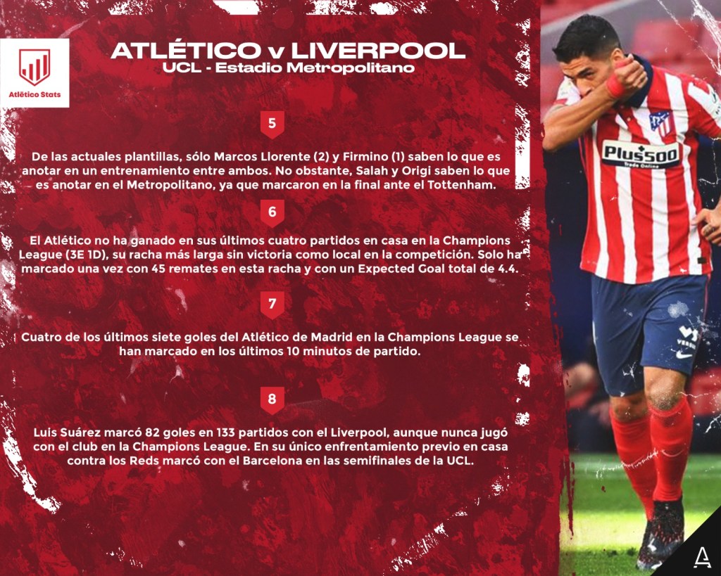 Atlético y Liverpool sólo se han enfrentado seis ocasiones, cuatro en Champions League y dos en Europa League. El balance es favorable para los colchoneros ya que han salido victoriosos en tres ocasiones, por una de los ingleses, mientras que dos acabaron en empates.