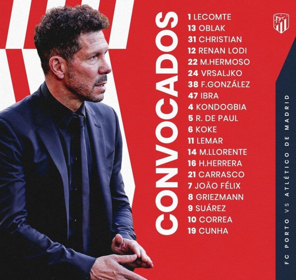 Simeone tendrá las bajas de Trippier, Felipe (sancionado), Giménez y Savic. Por su parte, en el Oporto no pueden contar con Conceicao, Joao Mario, Marcano, Pepe, Ramos ni Uribe