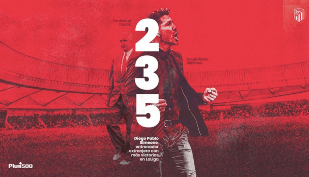 Diego Pablo Simeone continúa haciendo historia en el Atlético de Madrid. El argentino logró, ante el Getafe Club de Fútbol, su victoria número 235 en LaLiga como técnico, lo que le convierte en el preparador extranjero con más triunfos en la historia de la competición.
