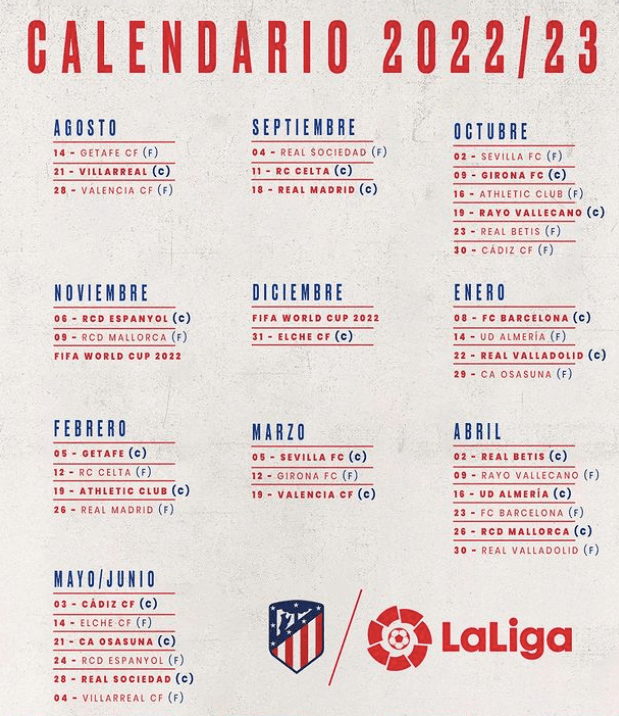 EL Atlético disputará su primer partido como local el fin de semana del 20-21 de agosto ante el Villarreal CF, afrontando el derbi madrileño ante el Real Madrid en casa en la sexta jornada (17-18 de septiembre) y recibiendo al FC Barcelona el 7-8 de enero de 2023.