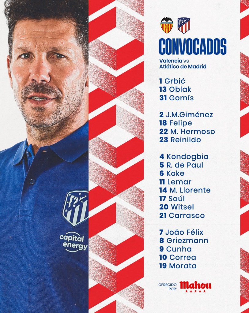 Atlético de Madrid: Oblak; , Giménez, Witsel, Reinildo; Marcos Llorente, Rodrigo De Paul, Koke, Lemar, Carrasco; Joao Félix, Morata