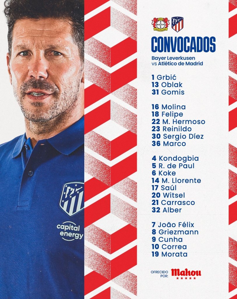 Simeone tendrá las bajas de Giménez, Reguilón ni Savic. Por su parte, en el Leverkusen no pueden contar con Adli, Bellarabi, Lunev, Palacios y Wirtz.