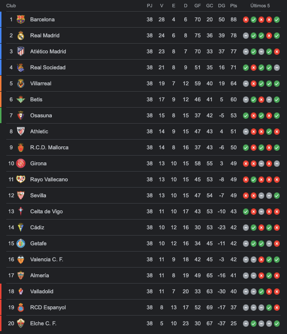ClasificaciónClasificación LaLiga Santander 2022-2023 Compártelo: Compartir en X (Se abre en una ventana nueva) X Compartir en Facebook (Se abre en una ventana nueva) Facebook Me gusta Cargando... Relacionado