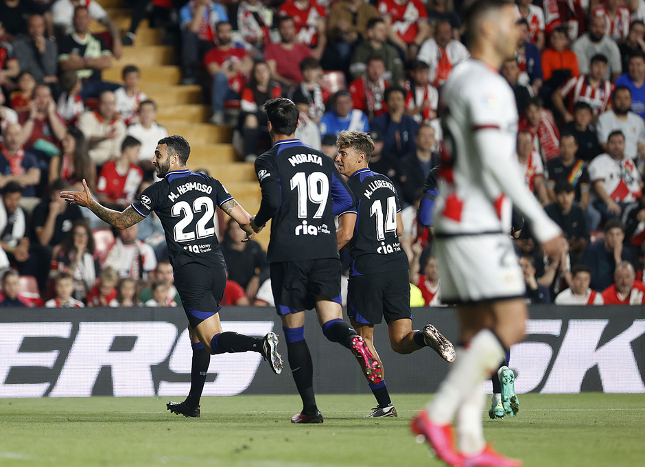 El gol, dedicado a Correa por el reciente fallecimiento de su madre, no vino solo, pues en un saque de esquina a los tres minutos, Hermoso, en su momento dulce, remató el 0-2 esquivando su marca y la mala salida de Dimitrievski. El Rayo terminó el acto llegando, con un disparo de Óscar que sacó Oblak, y en la reanudación dio el obligado paso al frente con Trejo, Camello y Falcao.