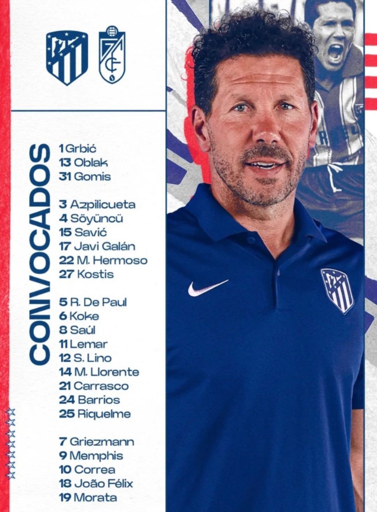 La plantilla colchonera no ha sido de las más reforzadas de LaLiga. A la entidad madrileña han llegado Soyuncu, Azpilicueta, Galán, Mouriño, Lino y Riquelme, que regresan, estos dos últimos de una cesión, y han abandonado el Metropolitano Lodi, Kondogbia y Doherty. Por su parte, el Granada se ha reforzado con Weissman, Villar, Famara, Gumbau, Manafá, Vallejo y Arezo.