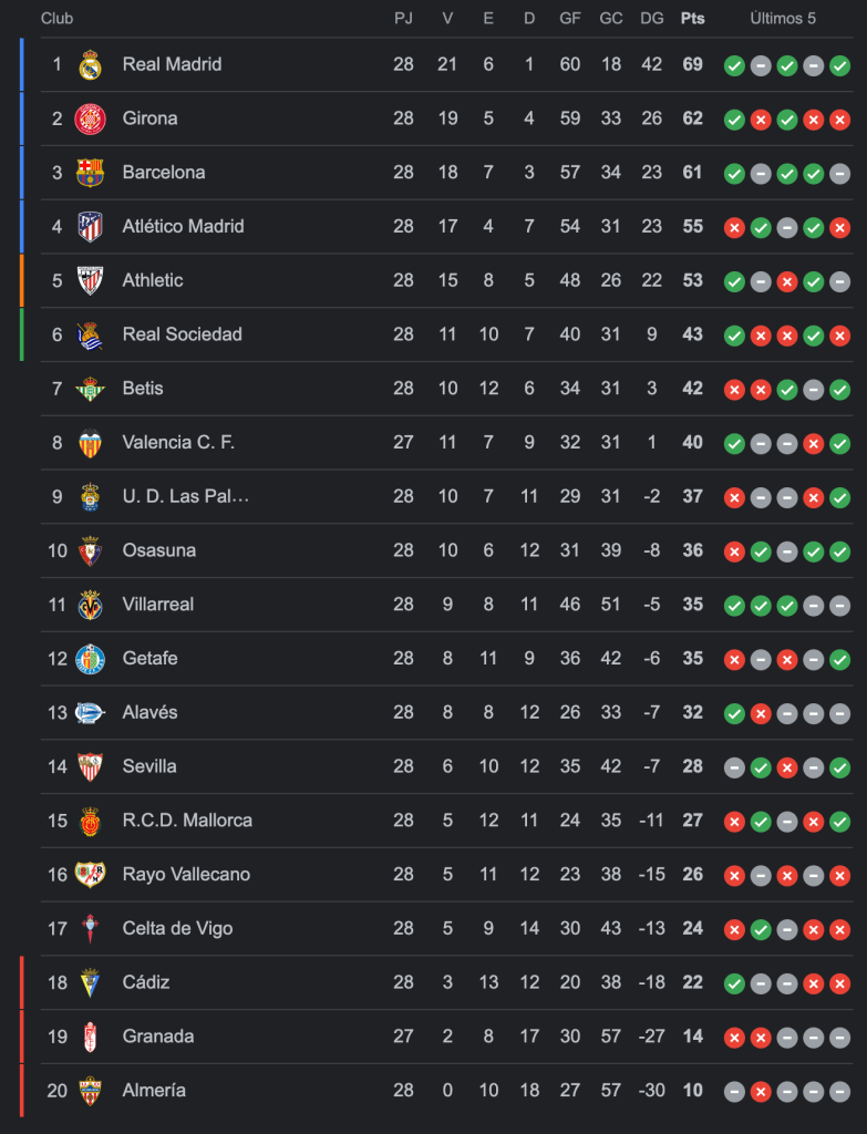 ClasificaciónClasificación LaLiga 2023-24 Compártelo: Compartir en X (Se abre en una ventana nueva) X Compartir en Facebook (Se abre en una ventana nueva) Facebook Me gusta Cargando... Relacionado