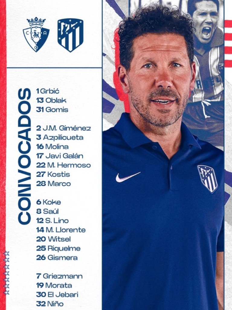Simeone tiene la baja de Barrios, Correa, Depay, Lemar, Rinildo, Vitolo, Savic, Soyuncu y De Paul, mientras que Arrasate no podrá contar con Brasanac ni Unai García.