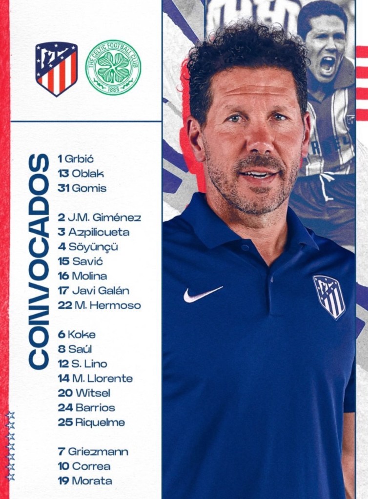 Los rojiblancos llegan segundos de grupo tras un empate injusto (1-1) en la primera fecha ante la Lazio en el Olímpico de Roma, una victoria en el Metropolitano (3-2) ante el Feyenoord y otra igualada en Celtic Park (2-2), mientras que los escoceses son últimos de grupo después de dos derrotas y un empate.