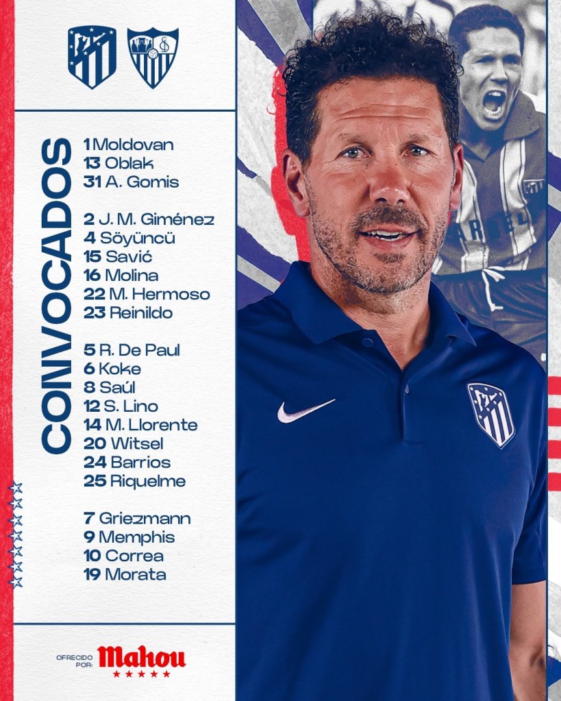 Atlético de Madrid: Oblak; Marcos Llorente, Giménez, Witsel, Hermoso, Lino; Saúl, Koke, De Paul; Griezmann y Morata.