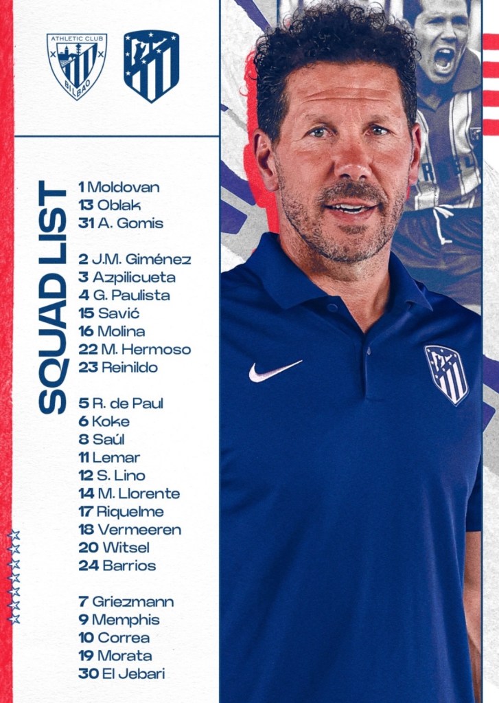 Atlético de Madrid: Oblak; Llorente, Witsel, Savic, Hermoso, Lino; Koke, De Paul, Sául; Morata y Correa