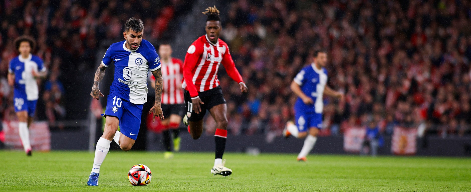 Quienes sí estaban eran los hermanos Williams, cuya conexión en el 13′ fraguó el 1-0. Nico se marchó por velocidad de Nahuel Molina en la banda izquierda y apuró casi hasta la línea de fondo para centrar al área, donde Iñaki apareció a la espalda de Hermoso en el segundo palo y conectó un voleón con la diestra, imparable para Jan Oblak ya que Hermoso estaba justo delante de él, en su campo de visión, y se agachó.