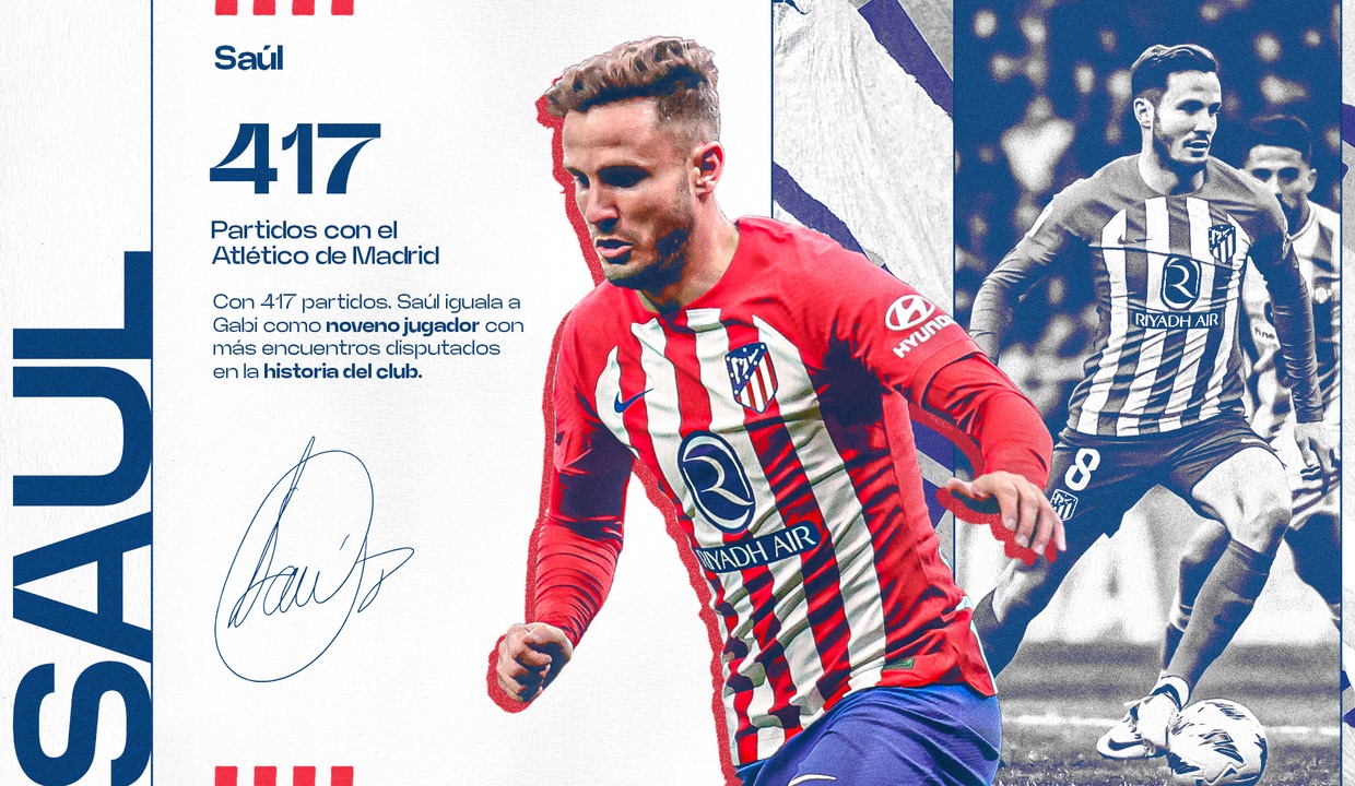 Saúl Níguez alcanzó los 417 partidos con el Atlético de Madrid tras jugar ante el Cádiz en la jornada 28 de LALIGA. Con esta cifra, iguala uno de los capitanes más icónicos, Gabi, en el noveno puesto de la clasificación de jugadores con más encuentros disputados con club madrileño. El centrocampista, nacido en Elche, cumple esta impresionante cifra a sus 29 años y tras más de una década de compromiso con la camiseta colchonera.