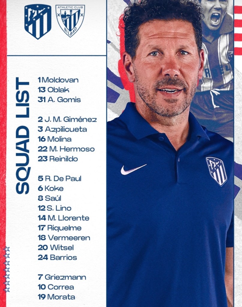 Atlético de Madrid: Oblak, Llorente, Axel Witsel, José María Giménez, Mario Hermoso, Samuel Lino; Rodrigo de Paul, Koke Resurrección, Pablo Barrios; Antoine Griezmann y Ángel Correa