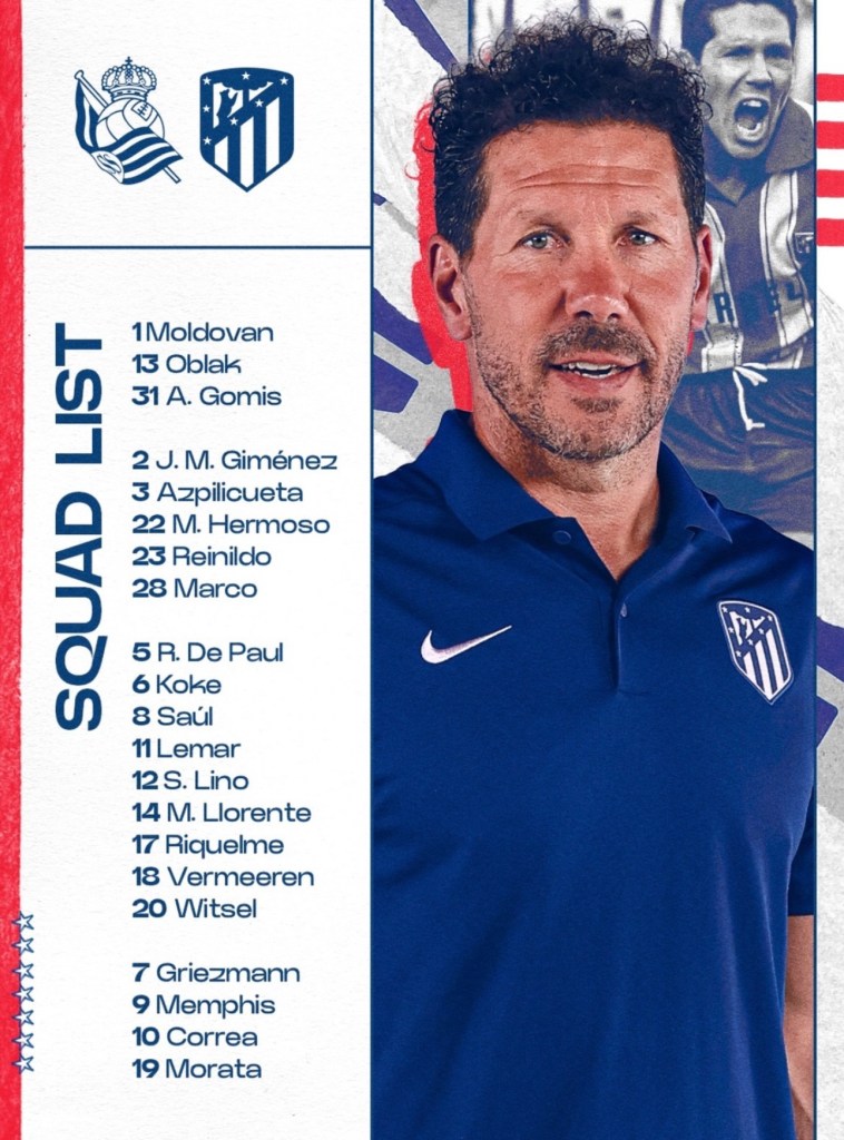 Atlético de Madrid: Oblak; Azpilicueta, Witsel, Gimenez, Hermoso, Lino; Llorente, De paul, Koke, Griezmann y; Correa.