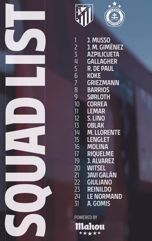 Atlético de Madrid: Oblak, Llorente, Witsel, Lenglet, Galán; De Paul, Barrios, Lino, Giuliano, Griezmann, Julián