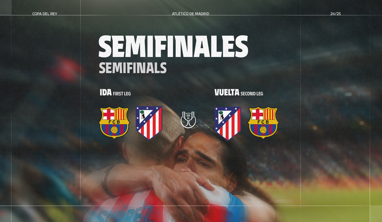 El FC Barcelona será el adversario del Atlético de Madrid en semifinales de la presente edición de la Copa del Rey, tal y como ha dictaminado el sorteo celebrado este miércoles en la Ciudad del Fútbol de Las Rozas. La eliminatoria -que se disputará a doble partido, con fechas y horarios pendientes de confirmación- vivirá su primer asalto en el Estadio Olímpico Lluís Companys el 25/26/27 de febrero, mientras que el encuentro de vuelta se celebrará en el Metropolitano el 1/2/3 de abril.