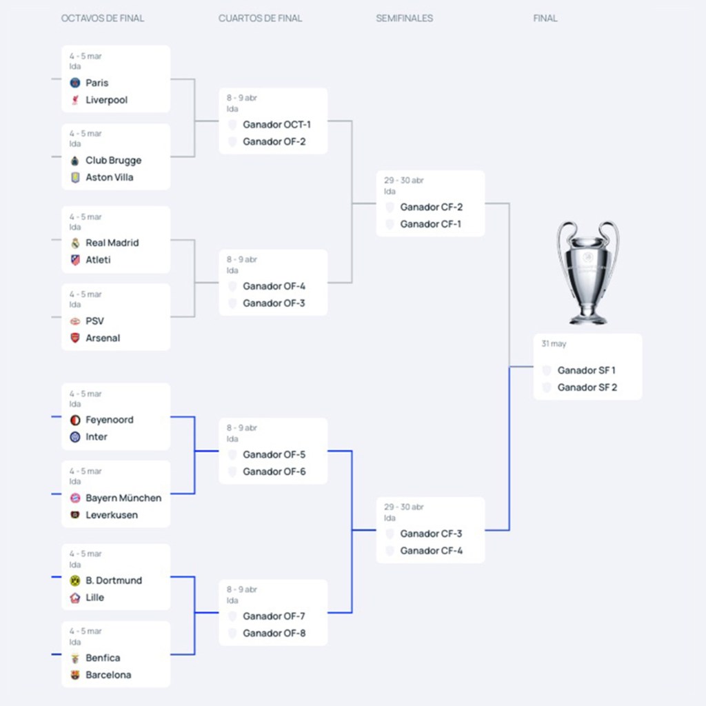 El Real Madrid será el adversario del Atlético en octavos de final de la presente edición de la Liga de Campeones, tal y como ha dictaminado el sorteo celebrado este viernes en la Casa del Fútbol Europeo en Nyon (Suiza). La eliminatoria vivirá su primer asalto en el Santiago Bernabéu el 4 o 5 de marzo, mientras que el encuentro de vuelta se celebrará en el Metropolitano el 11 o 12 del mismo mes en fechas y horarios pendientes de confirmación.